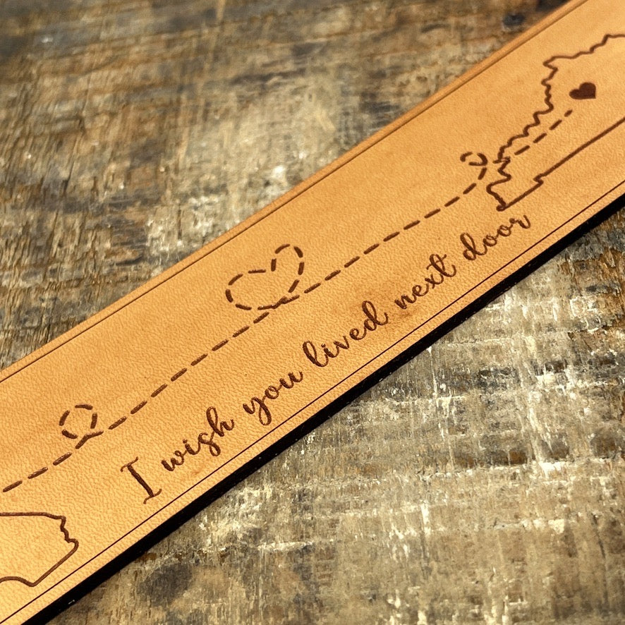 This long distance friendship leather bookmark features two states with a dotted line and the message “I wish you lived next door.” A heartfelt gift for best friends separated by miles, perfect for showing love and keeping friendship close across any distance.