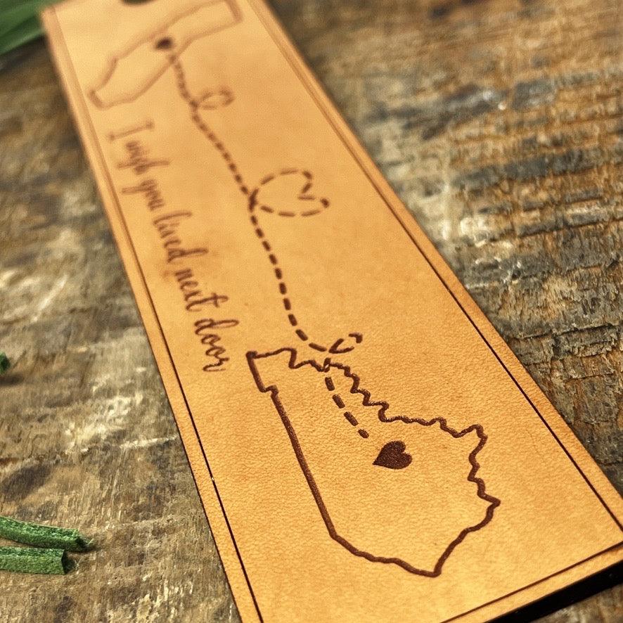 Long Distance Leather Bookmark – “I Wish You Lived Next Door” Two-State Design