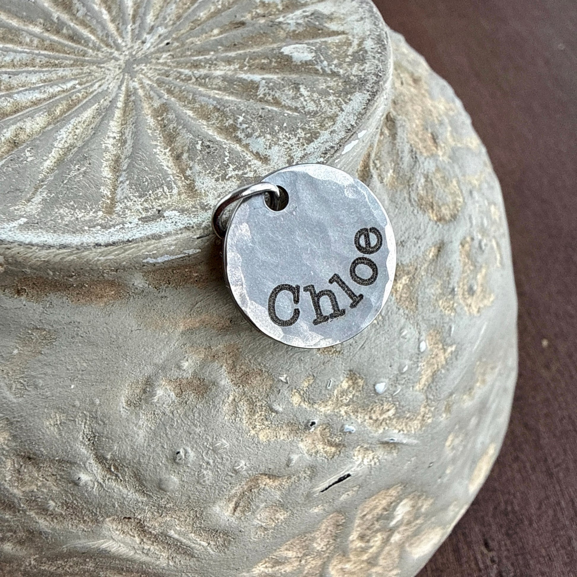 Personalized with a meaningful name, this hand-hammered charm transforms a simple detail into a lasting keepsake. Crafted from durable stainless steel with a luminous gold finish, it is water resistant and designed for everyday wear—an elegant, heartfelt piece created to keep the names that matter most always close.