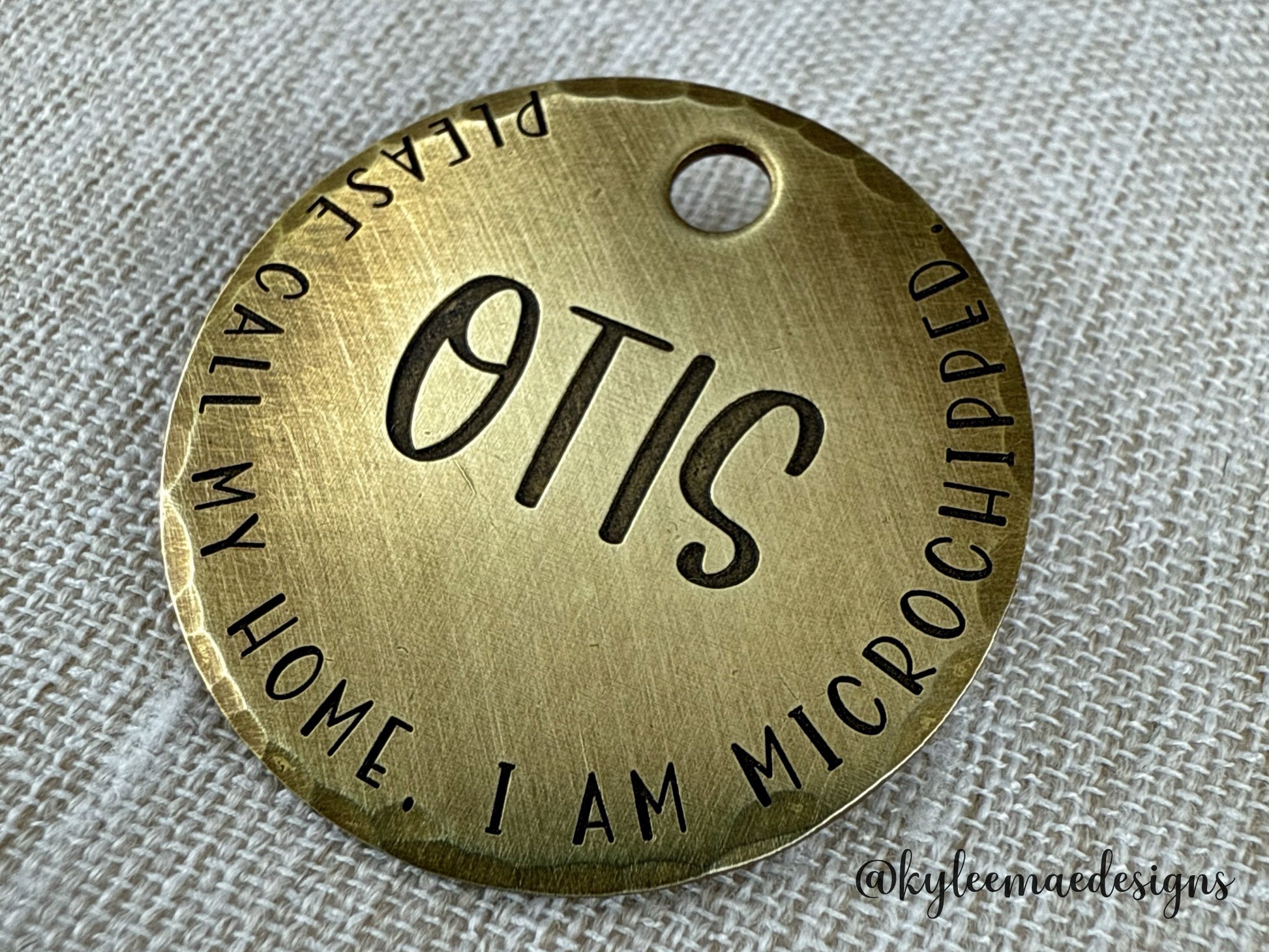 Solid brass engraved 1.25" dog tag with easy to read message around your pet's name in a handwritten style uppercase font. Around the edge tag reads "Please call my home. I am microchipped"
